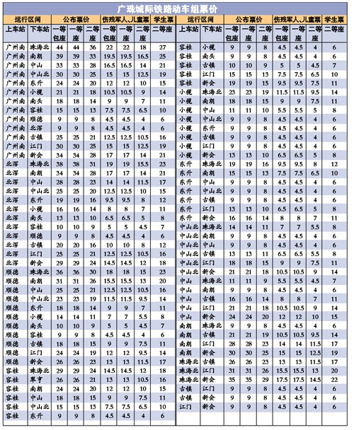 据介绍,广珠城轨最贵为广州南至珠海北的一等包座和一等座,每张票价为44元,二等座为36元,伤残军人、儿童和学生还将享受优惠,最便宜为4元一张,比如一张江门至新会的二等座儿童票。